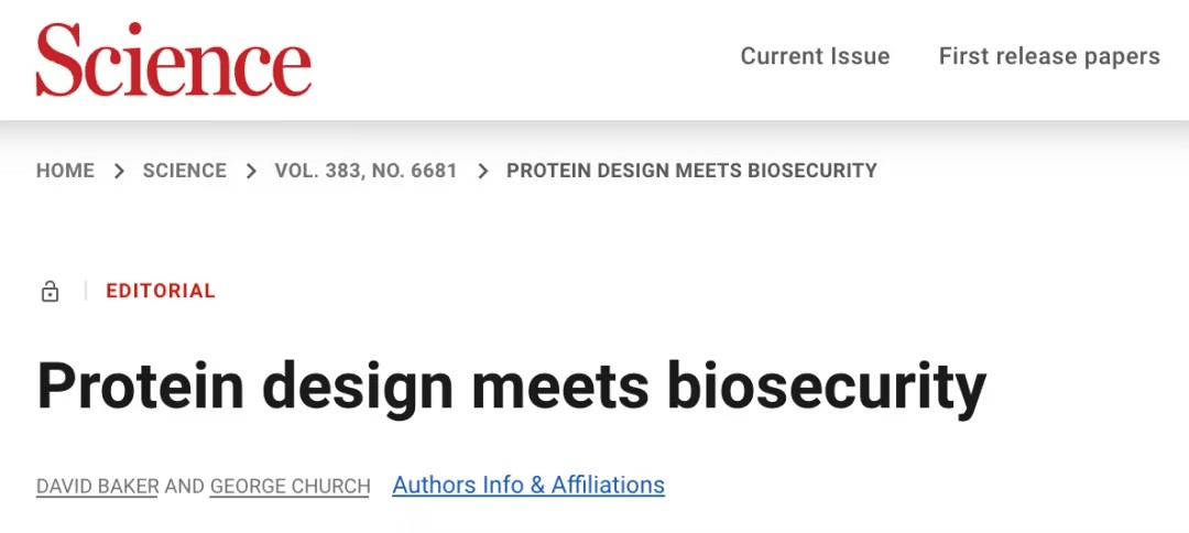 在此之前,David Baker 教授和哈佛大学遗传学家 George Church 教授在 Science 期刊发表了题为:Protein design meets biosecurity 的文章,介绍了对于AI蛋白质设计领域快速发展带来的生物安全问题的思考和建议。