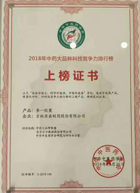 中药大品种科技竞争力排行榜上榜证书