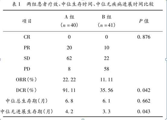 1.3 观察指标  两组患者均于治疗前完成常规检查。根据实体瘤治疗的近期疗效平均标准,分为:完全缓解(CR) 、部分缓解(PR) 、疾病稳定(SD) 和疾病进展(PD) 。其中,CR+PR = ORR (客观缓解率)CR + PR + SD =DCR(疾病控制率)