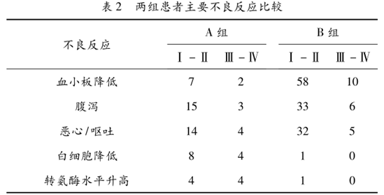 2.3 不良反应  B 组的主要不良反应为骨髓抑制、胃肠功能紊乱。主要体现于贫血、血小板减少,白细胞减少。A 组主要不良反应为中性粒细胞减少和胃肠道反应。血小板减少的发生率低于B( 10% vs 75.55% ),差异有统计学意义(P0.05)。胃肠道腹泻,两组间差异无统计学意义(P0.05) A 组恶心呕吐发生率明显高于对照组(20%41.1%) ,但差异无统计学意义( P0.05) 。其他不良反应少(见表 2)