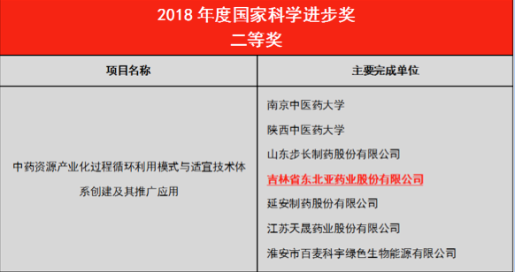 2019年1月8日,2018年度国家科学技术奖励大会在人民大会堂隆重召开,党和国家领导人出席大会并为2018年度国家科学技术奖获奖代表颁奖。亚泰医药集团子公司吉林省东北亚药业股份有限公司依托国家五类新药“黄芩茎叶解毒胶囊”与南京中医药大学等单位共同完成申报的“中药资源产业化过程循环利用模式与适宜技术体系创建及其推广应用”项目荣获“2018年度国家科学技术进步奖二等奖”。