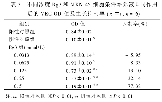 不同浓度Rg3与胃癌MKN-45细胞条件培养液共同作用的VEC OD值及抑制率见表3。阳性对照组OD值与阴性对照组差异有显著性(P<0.01);Rg3浓度为0.125~0.5mmol/L时,VEC OD值与阳性对照组差异均有显著性(P<0.01),抑制率为13.10%~77.38%。