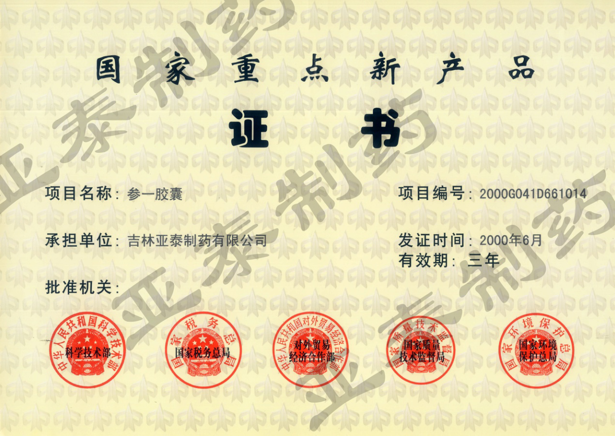 2000年国家重点新产品证书
