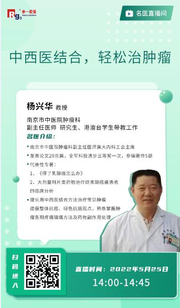 为了使广大患者及家属了解更多肿瘤防治的相关知识,5月25日14:00-14:45我们非常荣幸邀请到南京市中医院肿瘤科副主任医师杨兴华教授做客直播间,与大家分享《中西医结合,轻松治肿瘤》主题讲座。