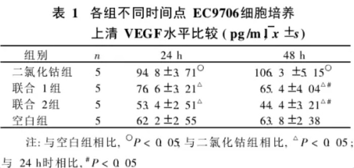 将75μmol/L的二氧化钴单独或联合30、60Lg/ml的Rg3作用于食管癌EC9706细胞24h和48h,分别收取细胞培养上清液,用ELISA法检测其中血管内皮生长因子(VEGF)水平,以含10%胎牛血清RPMI1640培养基做空白对照。