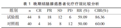 化疗疗效结果分析显示,试验组和对照组有效率(RR)分别为59.09%和50.00%,临床获益率(CBR)分别为86.36%和60.00%,两组比较有统计学意义(P<0.05)。见表1。