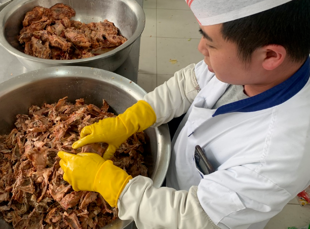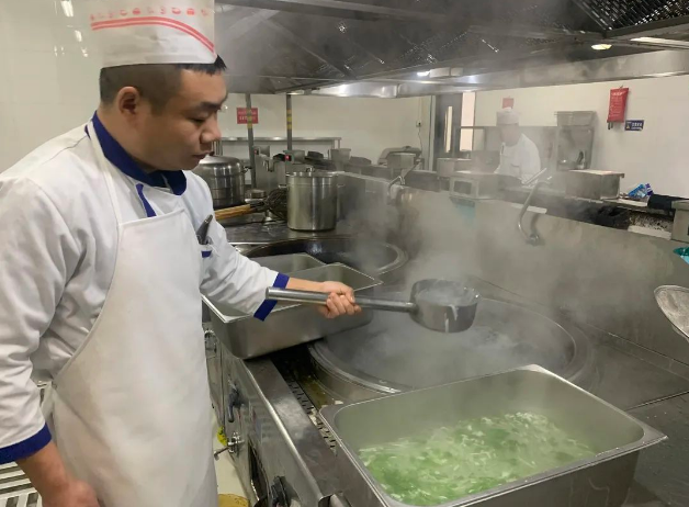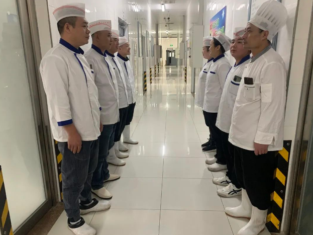 每天晨会后,餐饮中心全体员工都要穿着好工作服、佩戴帽子、口罩、手套进入厨房工作间,按照各自的工作任务开始准备当天的工作。