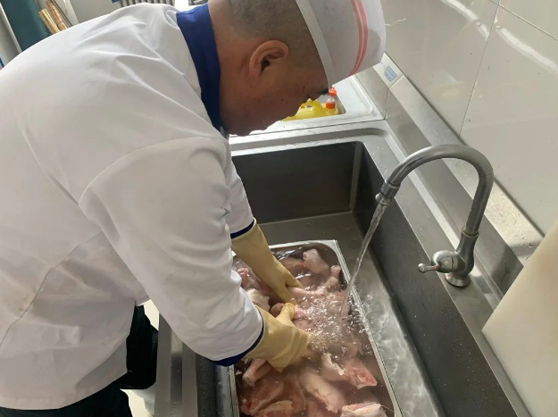 餐饮中心改刀员层层把关当日食材,认真严谨挑选、认真清理,确保让园区人员吃上放心餐。