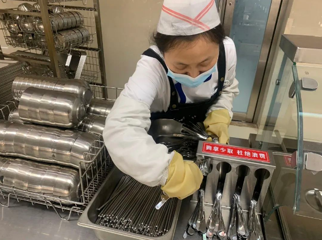 员工们用餐结束后,餐饮中心服务员开始给餐具消毒,清洁后厨卫生,认真做好餐饮中心食品、卫生安全,保障用餐安全卫生。