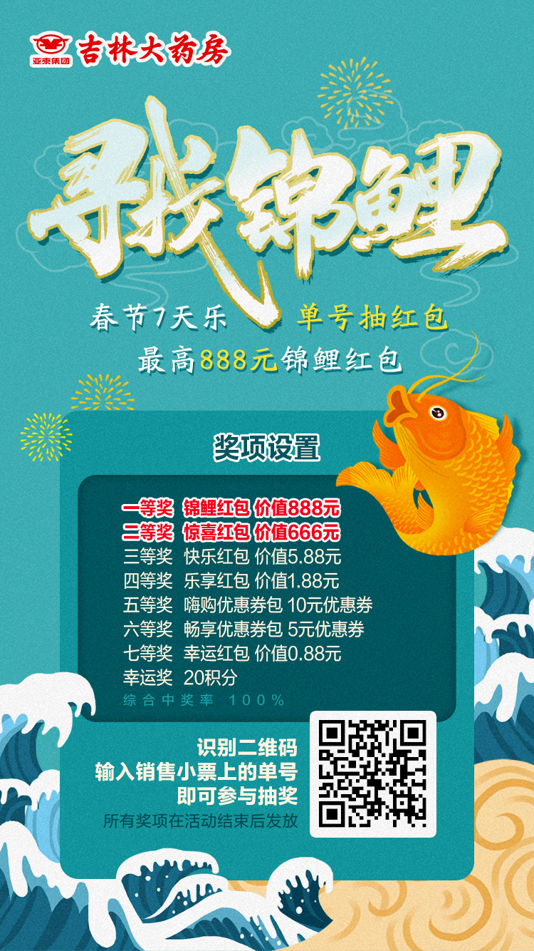 吉林大药房寻找锦鲤,过年7天乐,单号抽红包,最高888元等您拿!