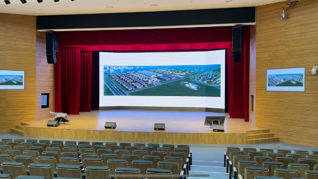 中韩亚泰北药园多功能报告厅位于园区A01栋大楼西南侧,建筑面积1700平方米,可同时容纳700人参会。厅内装修采用现代化、国际化、商务化风格,场地设施完善,同时拥有大型舞台、高清细腻LED大屏、阶梯式座椅、专业扩声、无线数字化会议及无线传声器等专业系统。