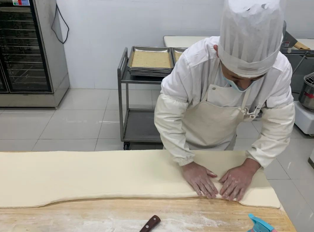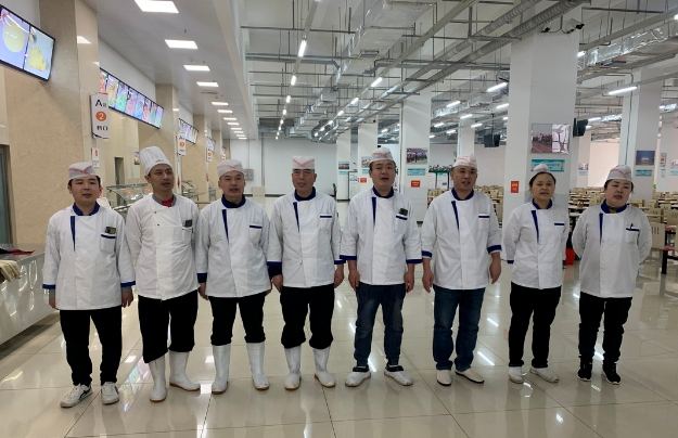 每天晨会后,餐饮中心全体员工都要穿着好工作服、佩戴帽子、口罩、手套进入厨房工作间,按照各自的工作任务开始准备当天的工作。
