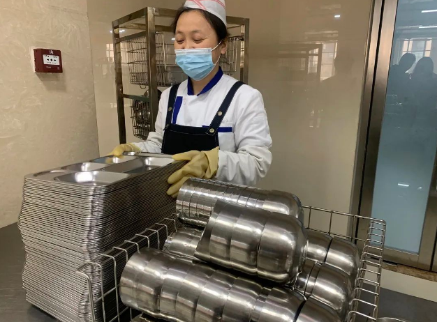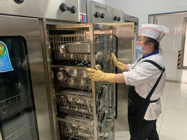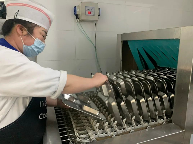 员工们用餐结束后,餐饮中心服务员开始给餐具消毒,清洁后厨卫生,认真做好餐饮中心食品、卫生安全,保障用餐安全卫生。