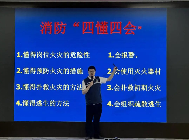 首先,全体参会人员在园区A01主楼二楼多功能会议厅集中组织开展了消防安全培训。消防安全专家结合《火灾警示教育片》视频,主要从落实企业主体责任、消防“四懂四会”、防火、灭火、火灾逃生救援等方面进行了详细讲解。