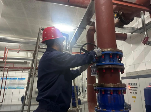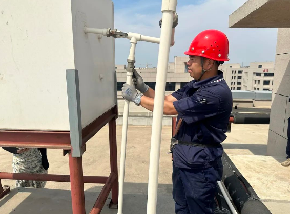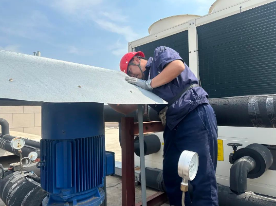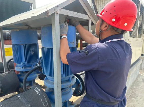 维修中心逐一对各楼宇内空调设备运行状况进行重点检查,保证空调制冷设备安全高效运行;对空调室内冷却水循环泵过滤器进行保养,确保管道供冷循环畅通,提高制冷效果;对空调主机系统及管线进行维修检查,确保设备达到最佳运行状态。
