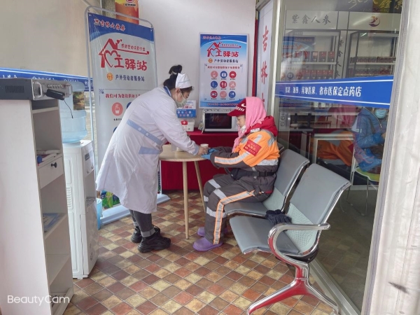 (吉林大药房爱心工驿站为清洁工提供热水和休息场所)