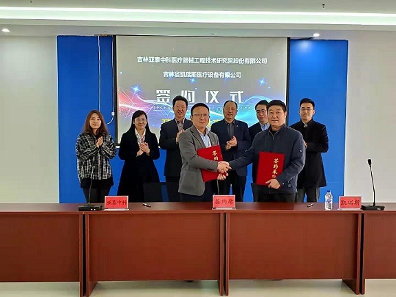 2021年3月19日上午,经过前期多轮协商讨论,吉林亚泰中科医疗器械工程技术研究院股份有限公司(以下简称亚泰中科)与吉林省凯瑞斯医疗设备有限公司(以下简称凯瑞斯医疗)正式结为战略合作伙伴,并于亚泰中科报告厅顺利举行签约仪式。出席仪式的领导有:亚泰医药集团总裁助理于明士、亚泰中科总经理崔继承、副总经理王今化、凯瑞斯医疗总经理陈辉、副总经理李允奉等。