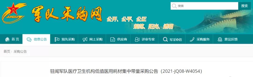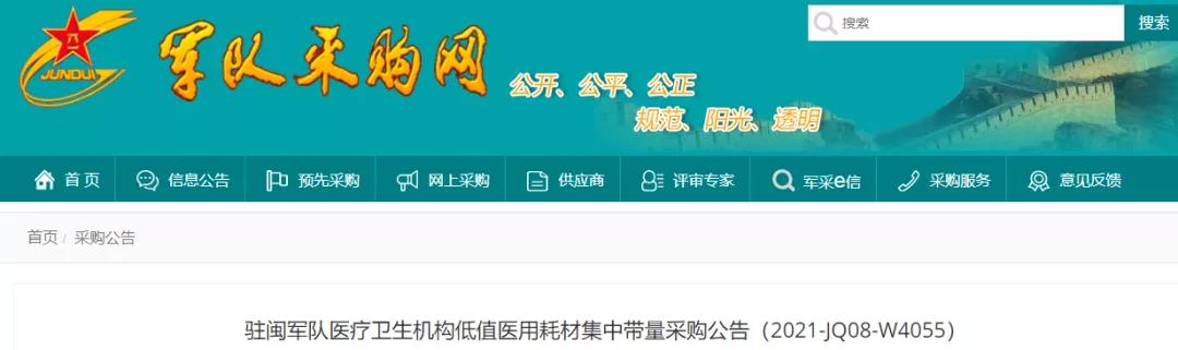 11月9日,军队采购网发布了两则驻闽军队医疗机构低值耗材带量采购公告。本次采购是全国首例由军队医疗机构自主带量的项目,此前军队医疗机构仅是参与带量,从未单独作为采购主体。