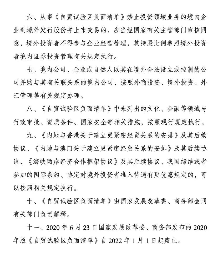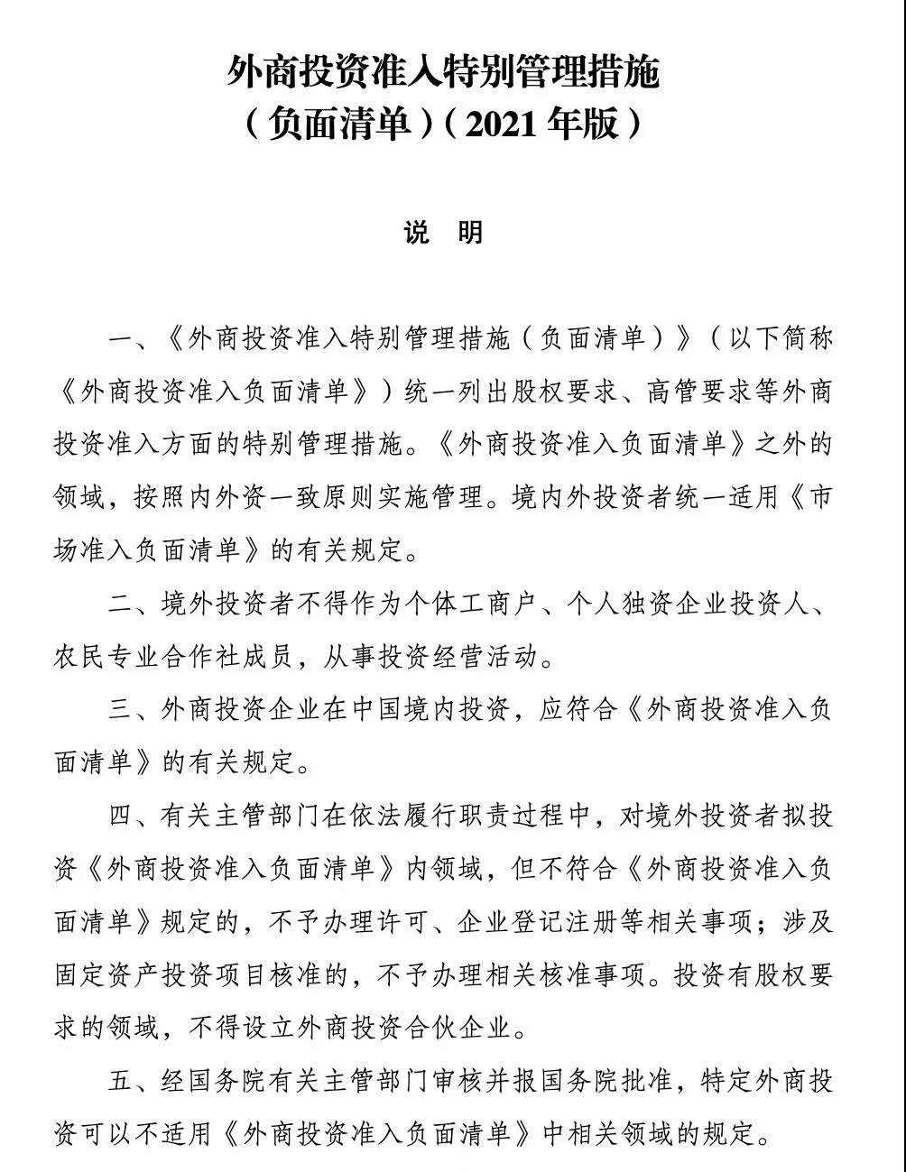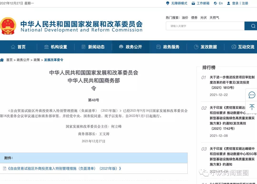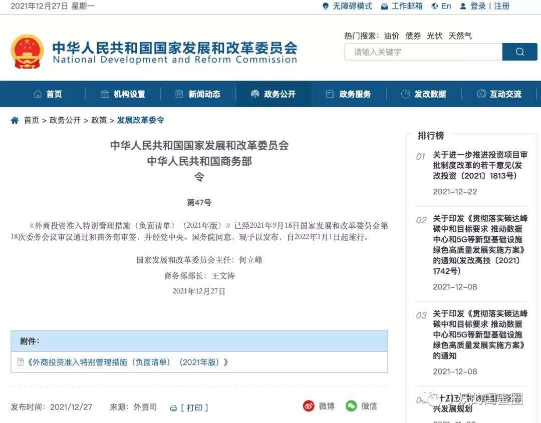 2021年12月27日,国家发展和改革委员会和商务部共同发布了第47号、第48号令,该令经党中央、国务院同意,由国家发展和改革委员会主任何立峰、商务部部长王文涛署名发布:《外商投资准入特别管理措施(负面清单)(2021年版)》、《自由贸易试验区外商投资准入特别管理措施(负面清单)(2021年版)》自2022年1月1日起施行。