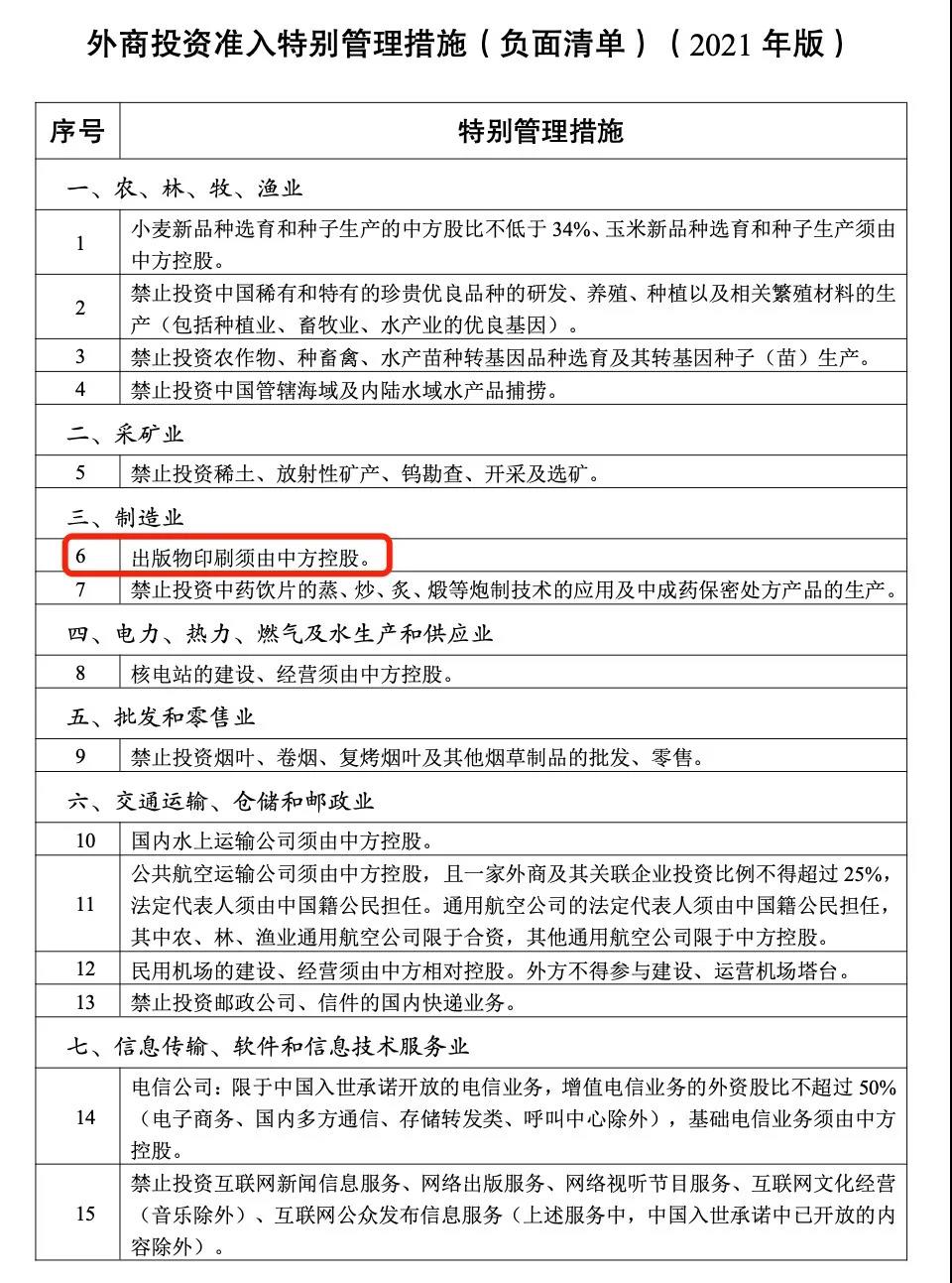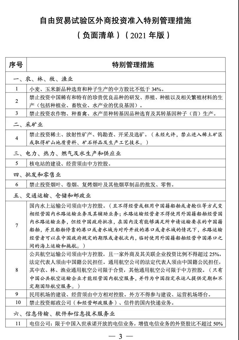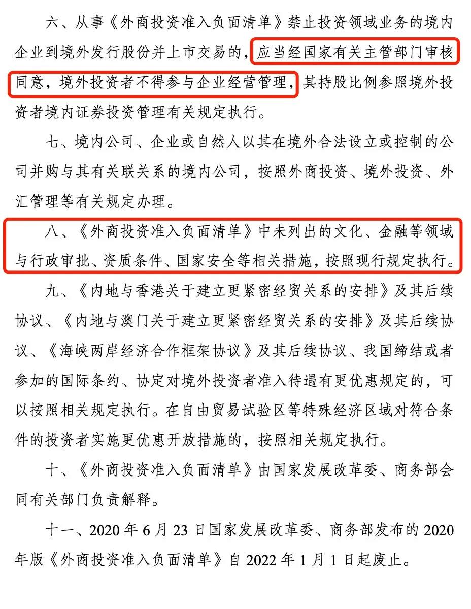 2021年12月27日,国家发展和改革委员会和商务部共同发布了第47号、第48号令,该令经党中央、国务院同意,由国家发展和改革委员会主任何立峰、商务部部长王文涛署名发布:《外商投资准入特别管理措施(负面清单)(2021年版)》、《自由贸易试验区外商投资准入特别管理措施(负面清单)(2021年版)》自2022年1月1日起施行。