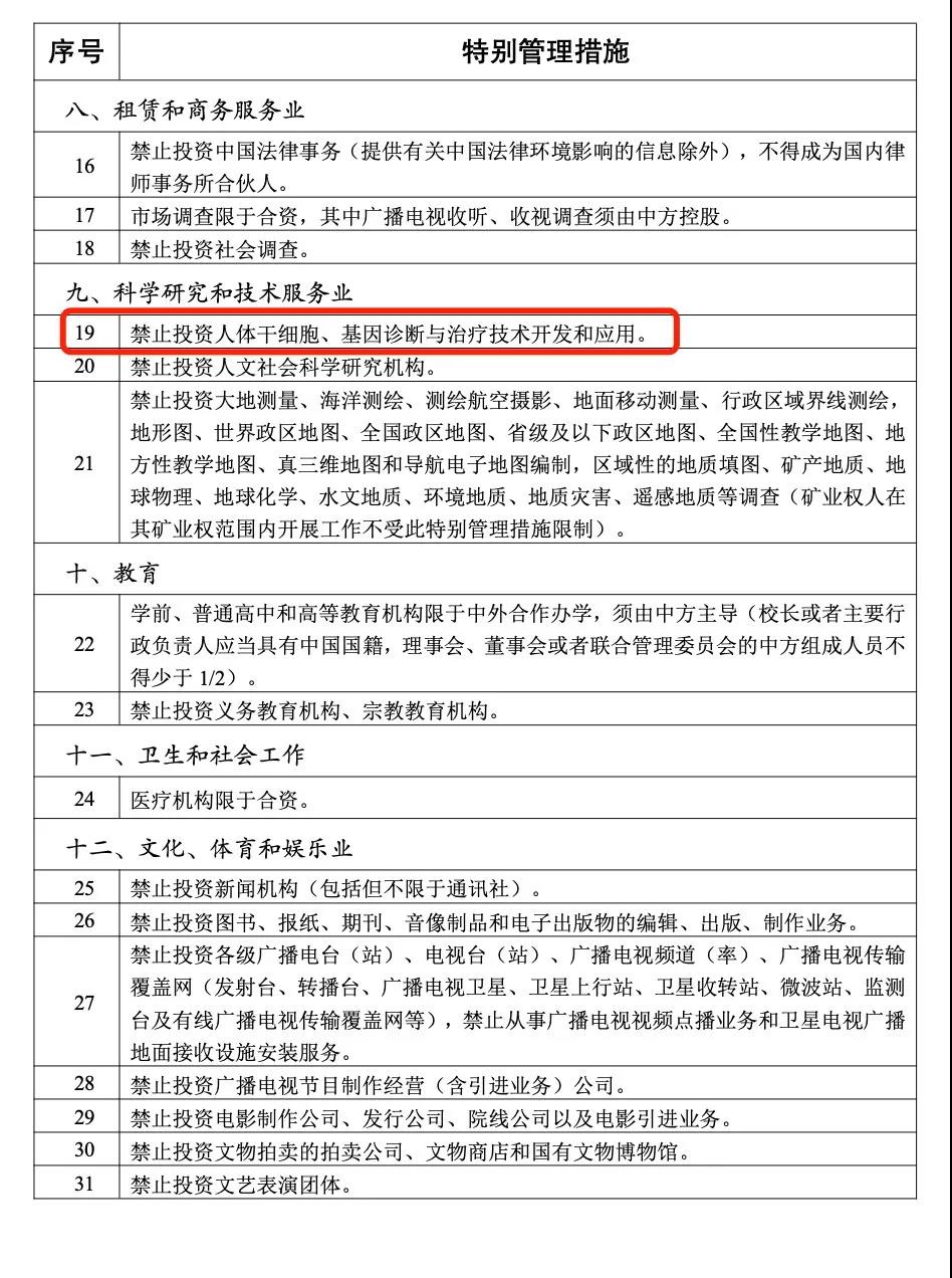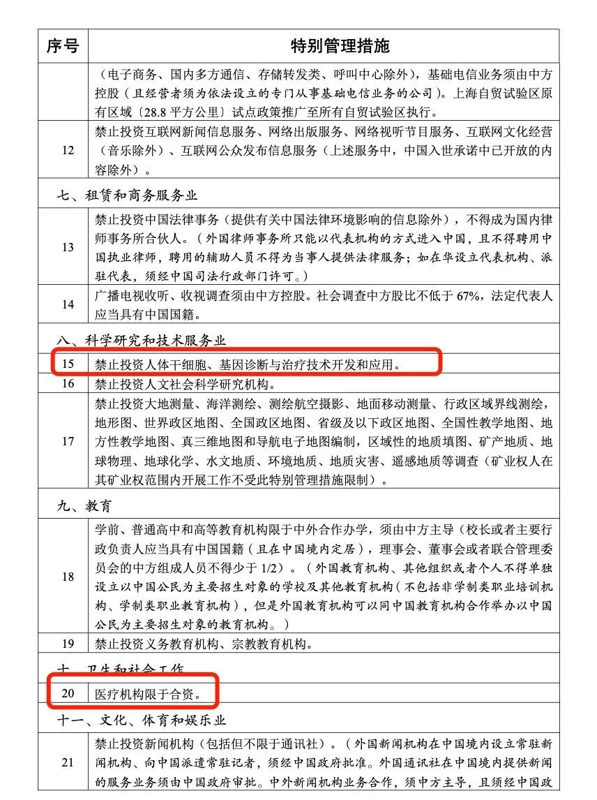 第47号、48号令指出,禁止外商投资“人体干细胞、基因诊断与治疗技术开发和应用”,“医疗机构限于合资”,以下为两个号令的具体内容。